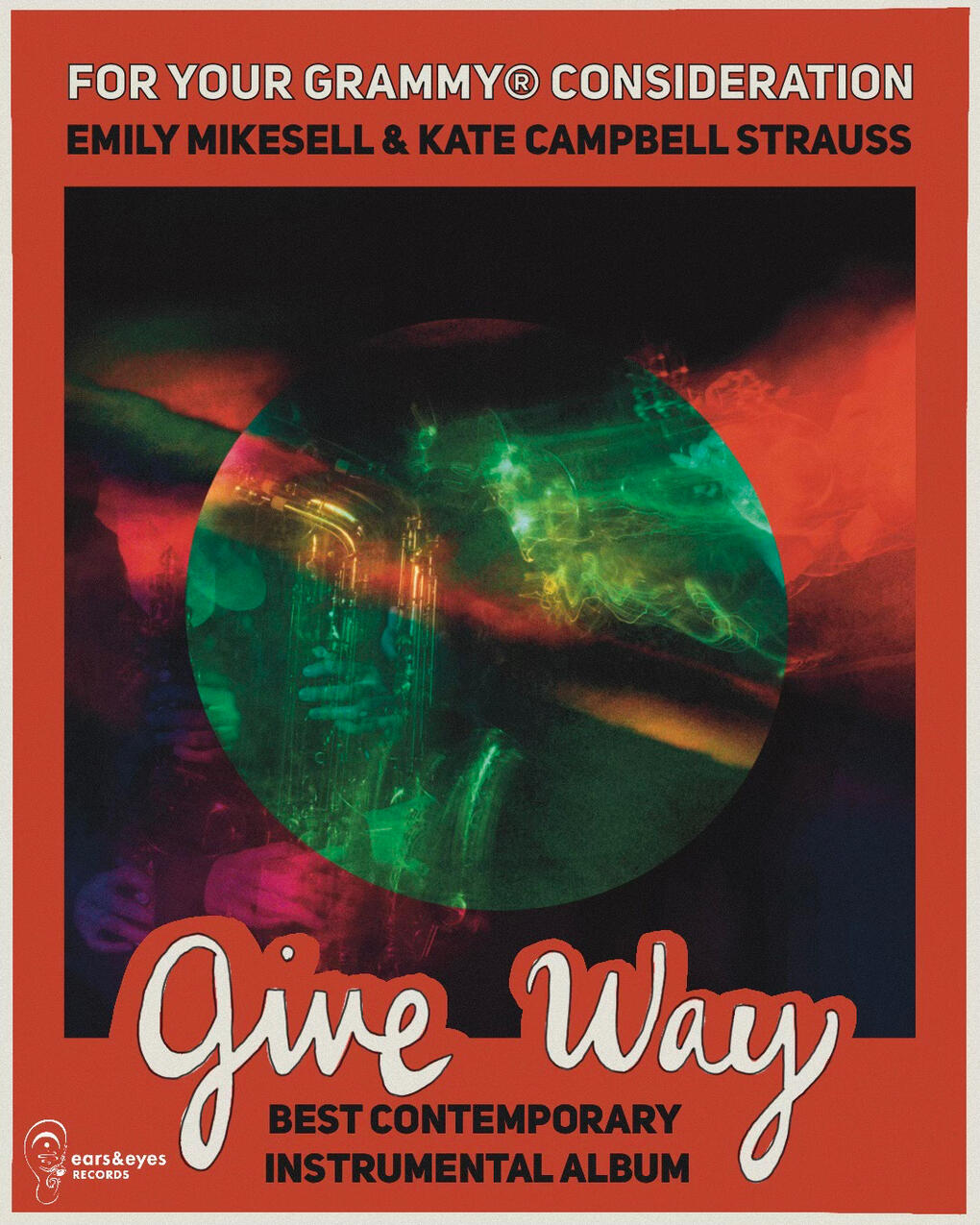 Give Way, a six-track album marks the debut collaboration between New Orleans musicians Kate Campbell Strauss and Emily Mikesell. Simple, sweet motifs and unexpected twists make the album sound like a fairytale, resplendent with new discoveries, moments of peril, and, above all else, an abiding tenderness. With each track, Campbell Strauss’s choir of saxophones and Mikesell’s layered trumpets cultivate a rich soundscape that both use as a canvas for musical exploration. Narrative cinematic tones reminiscent of Davis’s Sketches of Spain collide with the contemplative inflections of Philip Glass, as the restrained styles of Mikesell and Campbell Strauss leave ample space for the listener to join in on their sonic journeys.The album, which originated as a project at the University of New Orleans during the early months of the Covid-19 pandemic, is a stunning tribute to the power of organic spontaneity in art – stitched into the album’s tapestry is the blossoming of the friendship between the two musicians. Drawn to one another’s musical versatility, and their affinity for subtlety over displays of technical mastery in their own art, the two quickly recognized a creative compatibility. Perhaps most remarkably, their first meaningful encounter beyond class discussions and a local jam is captured in the album’s first track, “Cloud Castles.” And while each of the six songs is its self-contained vignette, the sequencing of the songs tells a larger story, of two unfamiliar but kindred musical voices coalescing into a symbiotic whole.From the collaboration’s outset, the two used an original compositional process prioritizing affirmation over criticism. Quarantined to their respective homes during the height of the pandemic, Mikesell or Campbell Strauss would start by selecting an abstract written prompt from which a new musical idea – a simple melody, a catchy hook, a wandering introduction – would germinate. This initial sketch would then give way to a complete song over time, as the two sent new drafts back and forth, building on each previous version by either adding a new part or extending the track. As the recording was continuously passed along, the song would grow in depth and length, revealing a composition that could only have come from these two voices during this unprecedented moment.While developing each song, Mikesell and Campbell Strauss celebrated the power of creative impulse by trusting their first instinct whenever adding to a track, and completing each song within two weeks of starting. This creative process, grounded in personal intuition and mutual trust, freed them both to find inspiration in the music itself, rather than using theory-infused assumptions to dictate what “should” come next. The result is a series of lush, original soundscapes that land firmly in the space between the big band and contemporary classical genres, with a sprinkling of influences from the lush tone of Dexter Gordon and Bjork’s ethereal pop.